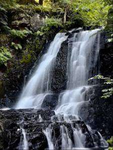 Vacker bokskog. Kuperat att gå. Vackert vattenfall i två etapper. Missa inte det nedre fallet. Lite svårt att ta sig fram till det nedre fallet. Gå genom betesmarken upp till Ensamma trädet. Akta betesdjuren.